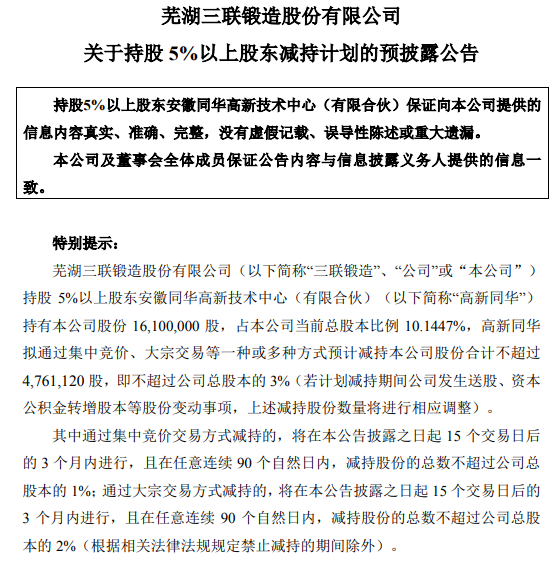 0 04-06 16:41三联锻造:持股5%以上股东拟减持不超过3%公司股份